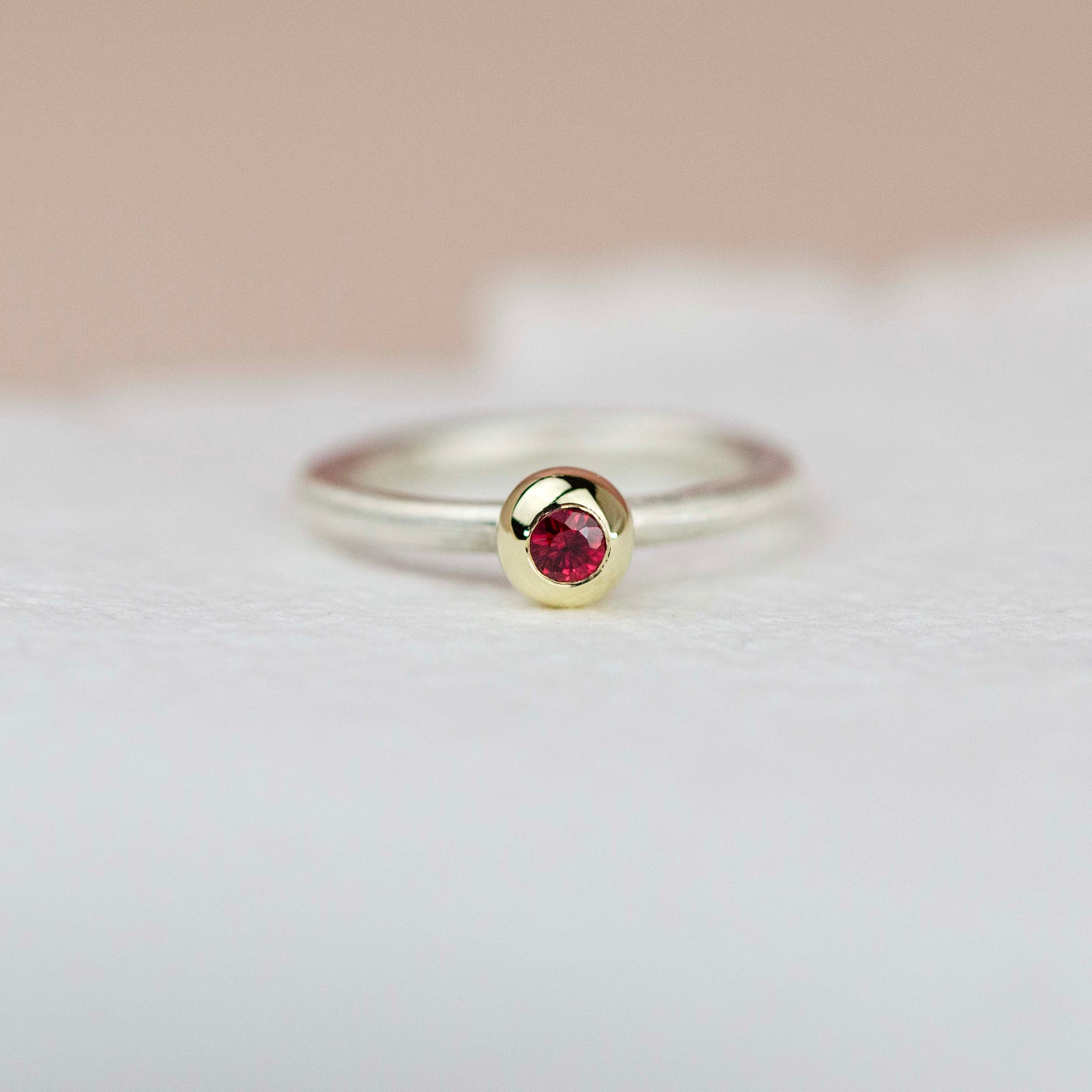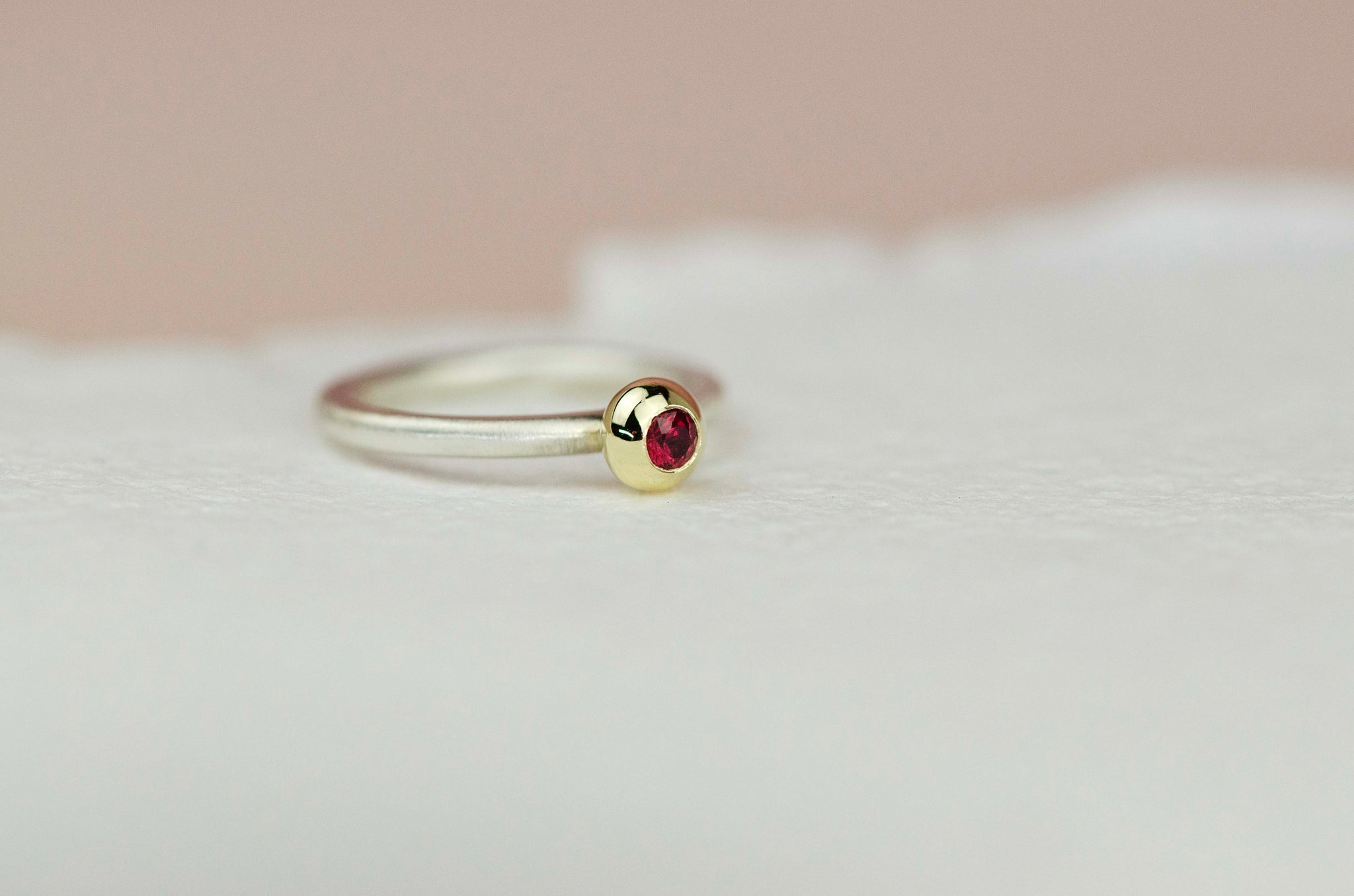 ORIGO S gyűrűk, 14 karátos sárgaarany foglalattal, 925 finomságú ezüst gyűrűsínnel készültek és cca. 3 mm átmérőjű drágakő díszíti.