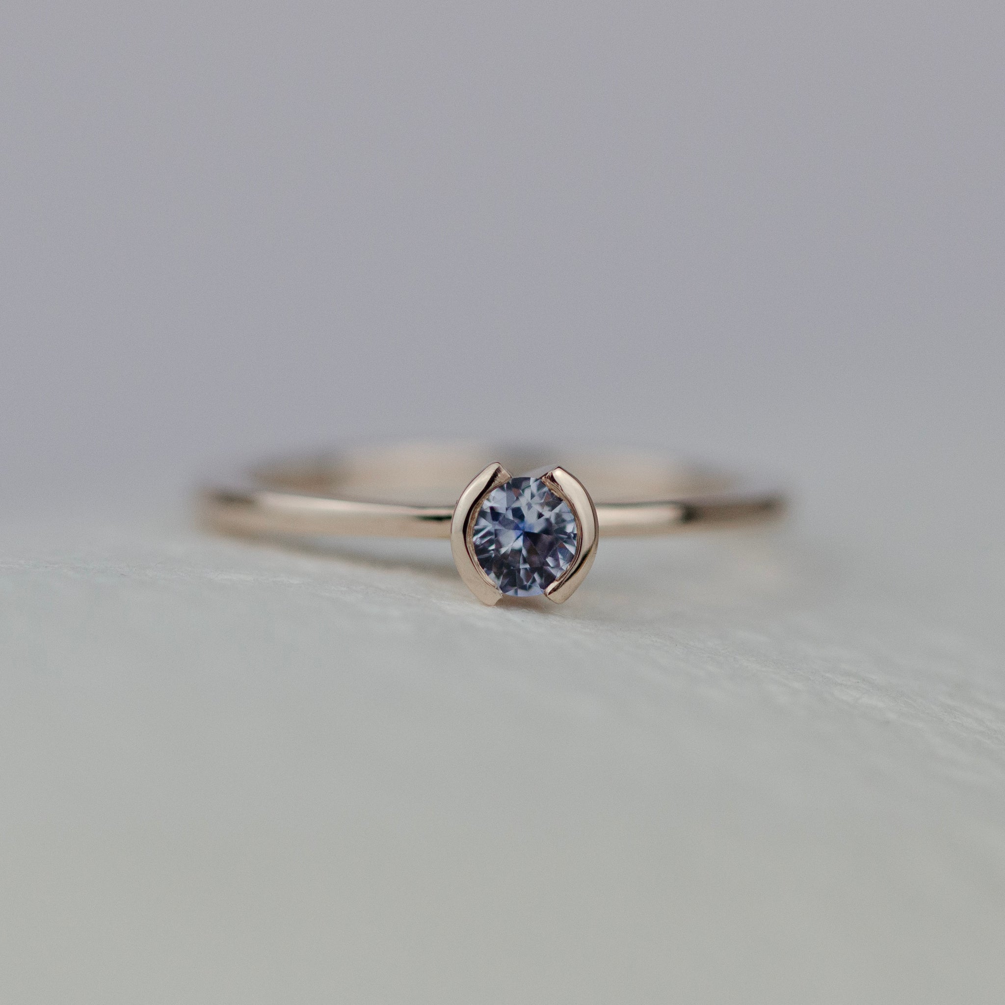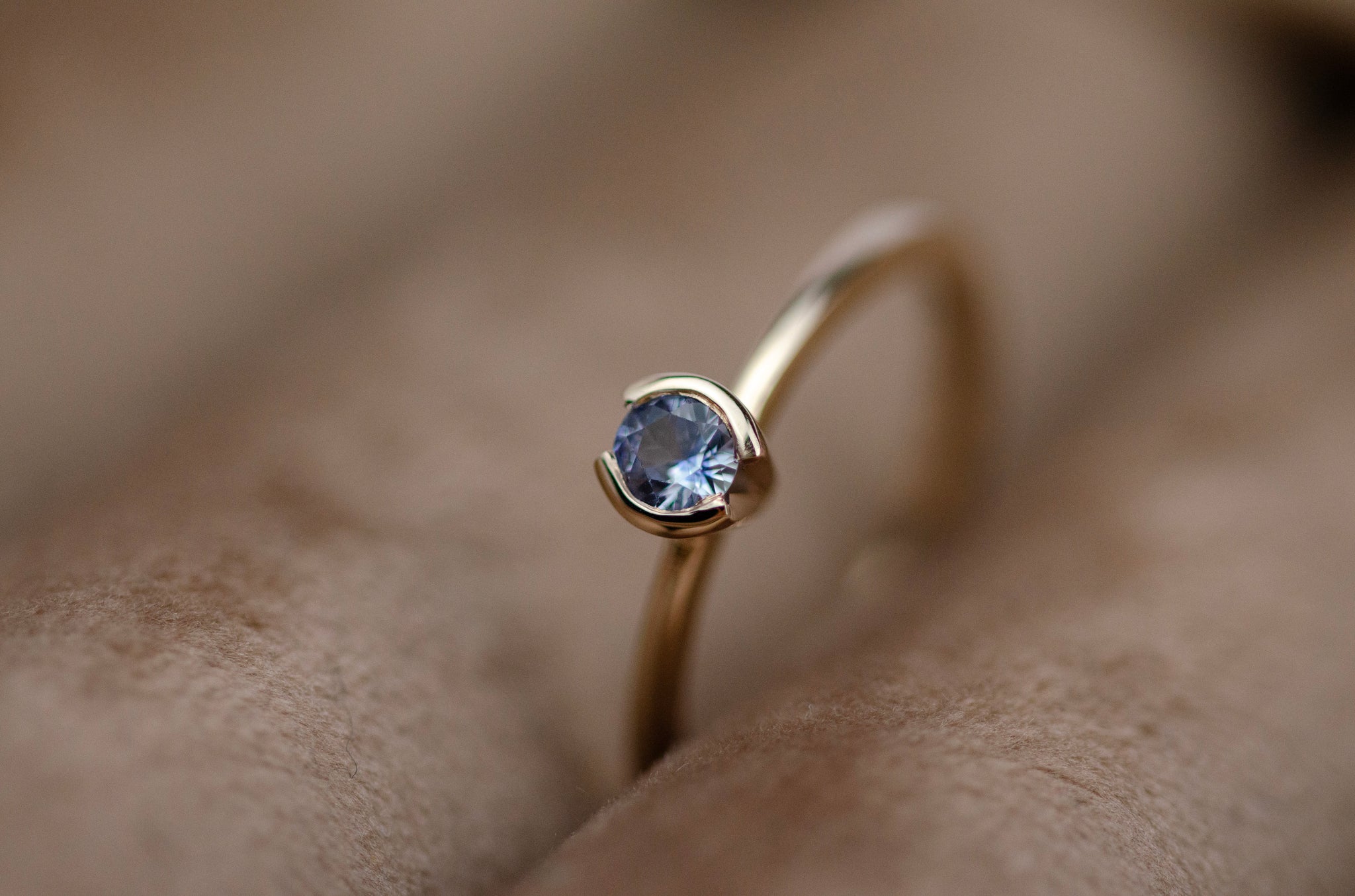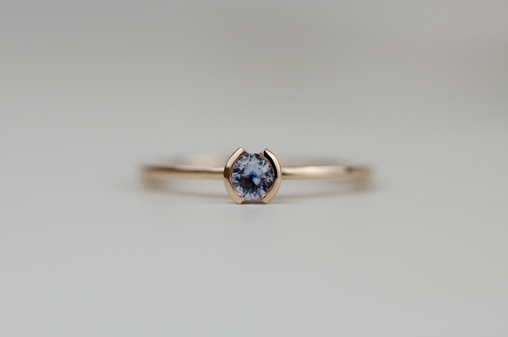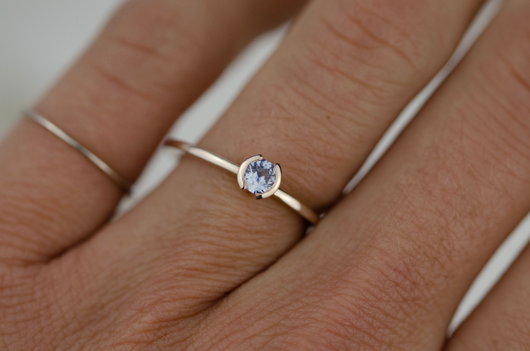 Ez a keskeny, képen szereplő gyűrű 14 karátos pezsgő aranyból készült és egy lenyűgöző 4 mm-es természetes kék zafír díszíti.